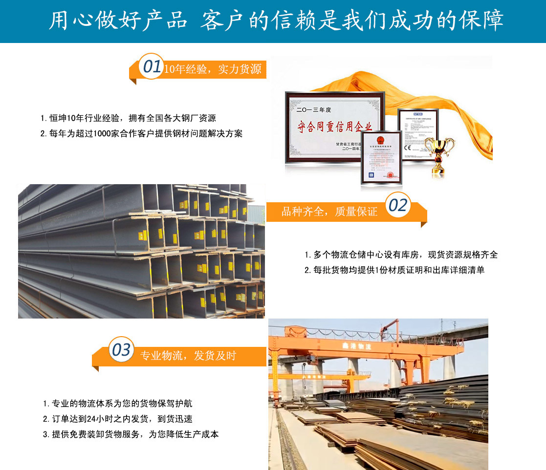 蘭州恒坤商貿(mào)有限公司立足于鋼材貿(mào)易,主要經(jīng)營:鋼板、角鋼、工字鋼、槽鋼、H型鋼、鍍鋅槽鋼、鍍鋅角鋼、鍍鋅板、鍍鋅卷、鍍鋅圓鋼、鍍鋅工字鋼多種型號鋼材產(chǎn)品。多年來,我公司始終堅持質(zhì)量第一,信譽至上的經(jīng)營方針,與酒鋼、包鋼、八鋼、唐鋼、鞍鋼、萊鋼、兗礦、日照鋼鐵、濟鋼,成都、天津等多家企業(yè)達成大批量物資供應協(xié)議,并且與省內(nèi)外多家客戶建立了合作關(guān)系。